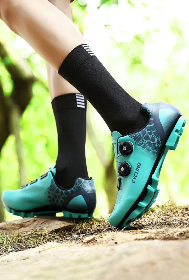 Crafted from high-quality leather and stretch spandex, these cycling shoes offer a snug, breathable fit that moves with you. The tough nylon outsole is precision-engineered to lock securely into clipless pedals, ensuring every push counts. Featuring a sleek sea green finish and a classic lace-lock closure, these shoes combine functionality with fashion—so you can ride with confidence and flair.