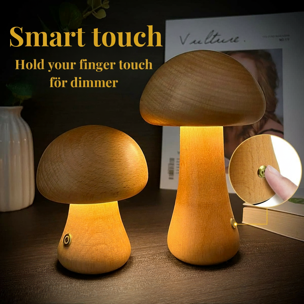 Wooden Mushroom LED Night Light – Dimmable Touch Lamp