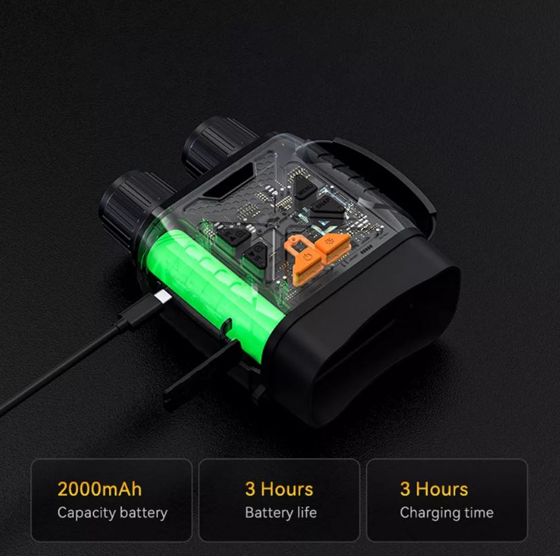 With a built-in 2000mAh lithium battery, these binoculars offer up to 3 hours of continuous use with night vision on and up to 8 hours in daylight mode.