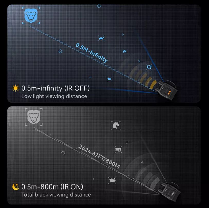 Equipped with a 7-level adjustable optical system, the HD Night Vision Binoculars allow you to see animals, plants, or objects clearly in low-light environments. The powerful infrared light (3W, 850NM) ensures visibility over vast distances, from 0.5 meters up to 800 meters in complete darkness.